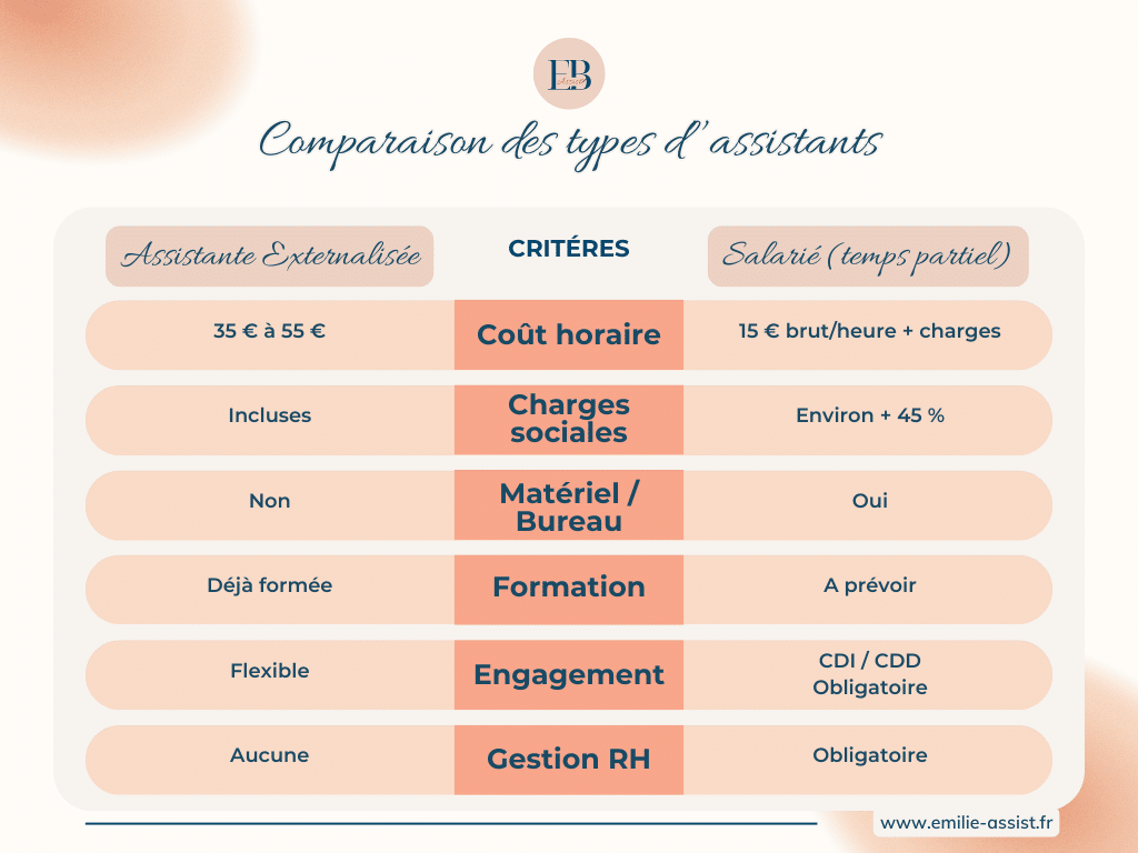 💡 Conclusion : Une assistante externalisée revient souvent moins cher qu’un poste salarié dès lors qu’il s’agit de moins de 40h/mois.